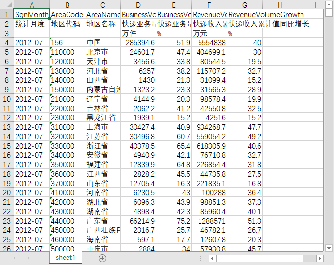 统计月度 地区代码 地区名称 快递业务量累计值 快递业务量累计值同比增长 快递收入累计值 快递收入累计值同比增长