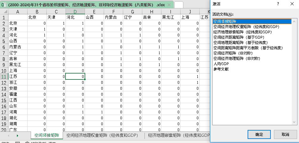 (2000-2024)年31个省市的邻接矩阵、经济地理矩阵、非对称经济地理矩阵(八类矩阵) .xlsx