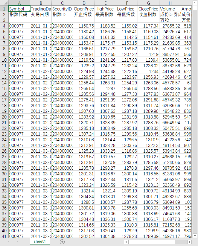 指数代码 交易日期 指数ID 开盘指数 最高指数 最低指数 收盘指数 成份证券成交量 成份证券成交金额 指数回报率