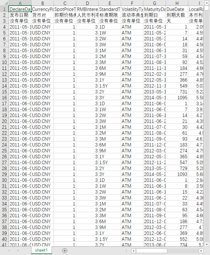 发布日期 货币对 即期价格类型 人民币利率类型 标准期限 波动率类型 到期日 到期天数 本币利率(%) 外币利率(%) 隐含波动率(%) 外汇掉期点 即期价格 执行价格 看涨期权delta 看跌期权delta