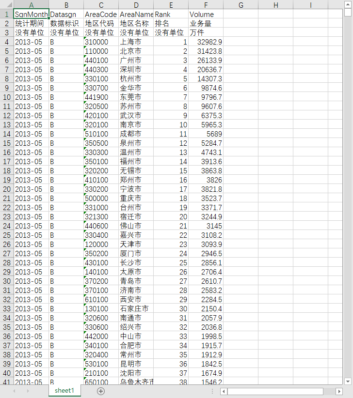 统计期间 数据标识 地区代码 地区名称 排名 业务量