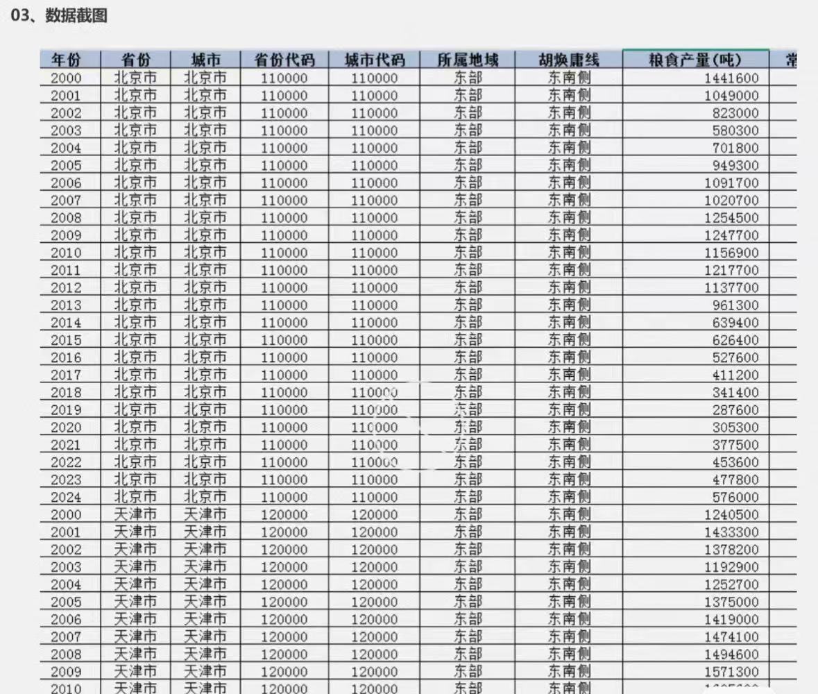 年份 省份 城市 省份代码 城市代码 所属地域 胡焕庸线 粮食产量(吨) 常住人口(千人) 农村常住人口(千人) 人均粮食产量(吨/人) 农村人均粮食产量(吨/人)