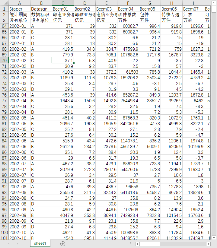 统计期间 数据标识 邮政业务总量 函件总数 包裹 快递 汇票 订销报纸累计数 订销杂志累计数 集邮业务 邮政储蓄期末余额