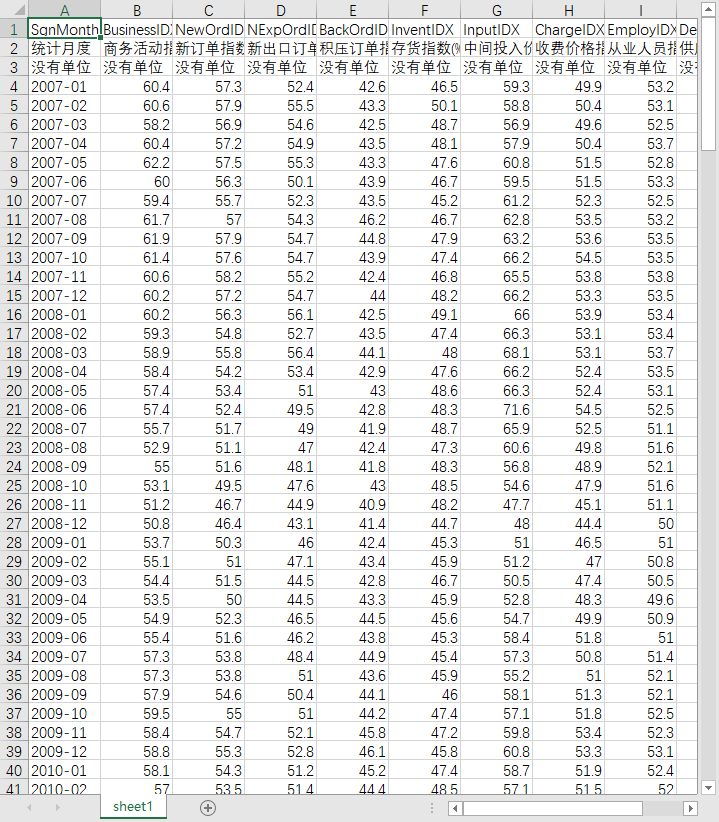 统计月度 制造业采购经理指数(%) 生产指数(%) 新订单指数(%) 新出口订单指数(%) 积压订单指数(%) 产成品库存指数(%) 采购量指数(%) 进口指数(%) 购进价格指数(%) 原材料库存指数(%) 从业人员指数(%) 供应商配送时间指数(%) 生产经营活动预期指数(%)