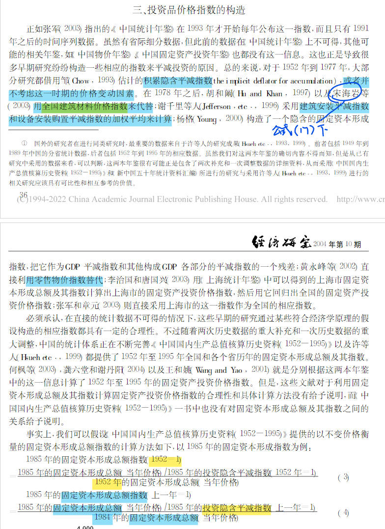 永续盘存法是国际上通用的资本存量估算方法,最早由Goldsmith(1951)提出。该方法通过累积历年投资流量,并考虑折旧因素,计算得出资本存量。在中国的应用中,学者们通常选择1952年或1978年作为基期,利用固定资产投资价格指数将名义投资额转换为实际投资额。