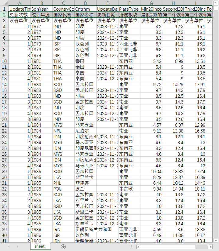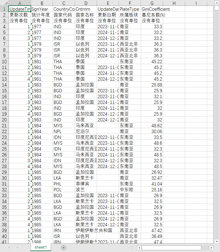 更新次数 统计年度 国家代码 国家名称 更新日期 所属板块 基尼系数(%)