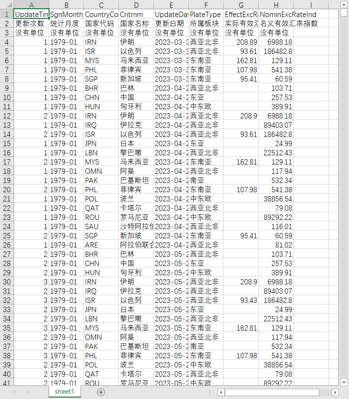 更新次数 统计月度 国家代码 国家名称 更新日期 所属板块 实际有效汇率指数 名义有效汇率指数