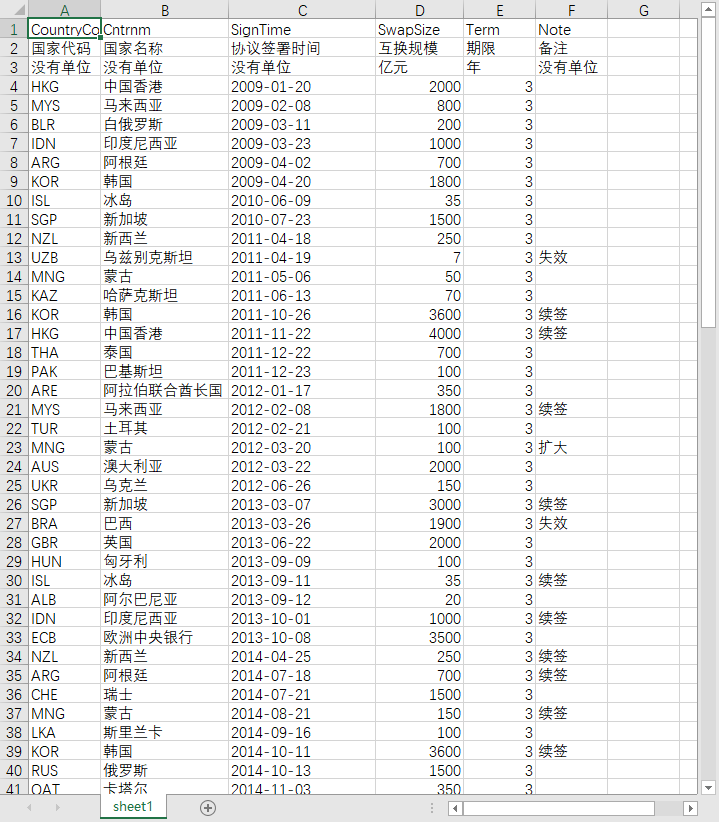 国家代码 国家名称 协议签署时间 互换规模 期限 备注