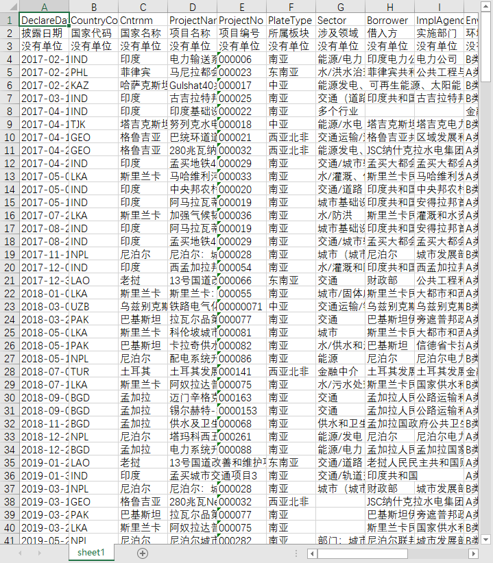 披露日期 国家代码 国家名称 项目名称 项目编号 所属板块 涉及领域 借入方 实施部门 环境和社会分类 项目信息拟定或更新日期 董事会审议日期 董事会决议 项目预估总成本 亚投行投资金额