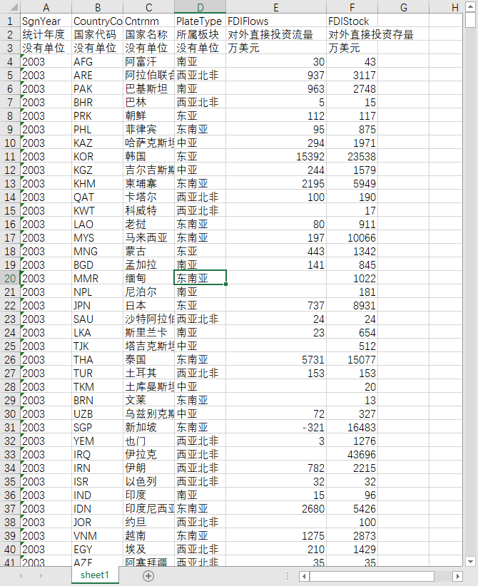 统计年度 国家代码 国家名称 所属板块 对外直接投资流量 对外直接投资存量
