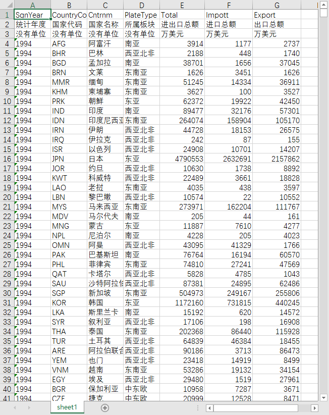统计年度 国家代码 国家名称 所属板块 进出口总额 进口总额 出口总额