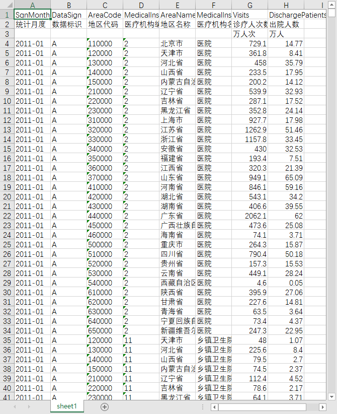 统计月度 数据标识 地区代码 医疗机构编码 地区名称 医疗机构名称 诊疗人次数 出院人数