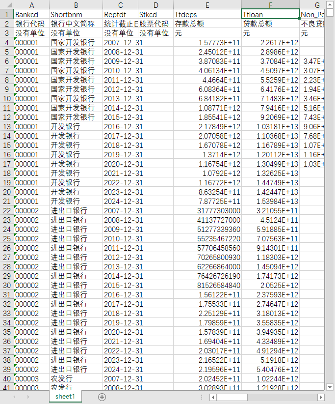 银行代码 银行中文简称 统计截止日期 股票代码 存款总额 贷款总额 不良贷款余额 生息资产 计息负债 净利差 净息差 同业往来资产 同业往来负债 权益对负债比率 留存收益资产比 息税前利润与资产总额比 总资产周转率 净资产收益率 加权平均净资产收益率 平均总资产回报率 扣除非经常性损益加权平均净资产收益率 证券投资 证券投资占比 同业资产对生息资产比率 存款对计息负债比率 同业负债对计息负债比率
