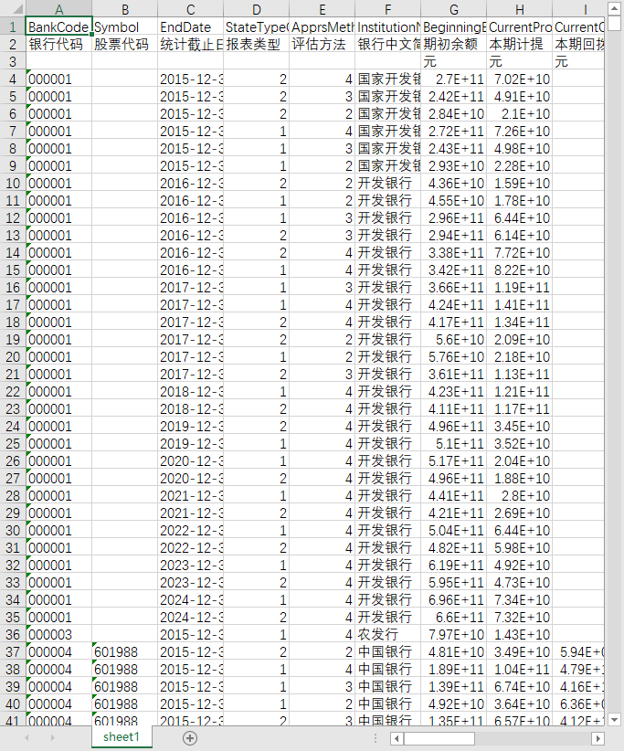 银行代码 股票代码 统计截止日期 报表类型 评估方法 银行中文简称 期初余额 本期计提 本期回拨 本期转入 其中:收回原转销贷款和垫款转入 其中:收回已置换的贷款 其中:其他转入 本期核销及转出 其中:贷款价值因折现价值上升转出 其中:已减值贷款利息冲转 其中:本期核销 其中:其他转出 汇率差异 期末余额 说明
