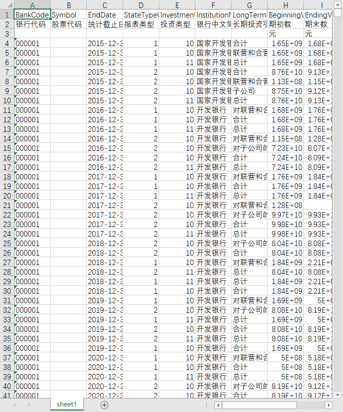 银行代码 股票代码 统计截止日期 报表类型 投资类型 银行中文简称 长期投资项目 期初数 期末数 备用1(权益比率) 说明