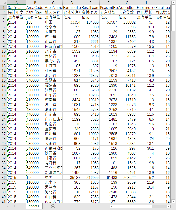 统计年度 地区代码 地区名称 农林牧渔业贷款 农村(县及县以下)贷款 农户贷款 涉农贷款 同比增长-农林牧渔业贷款(%) 同比增长-农村(县及县以下)贷款(%) 同比增长-农户贷款(%) 同比增长-涉农贷款(%)