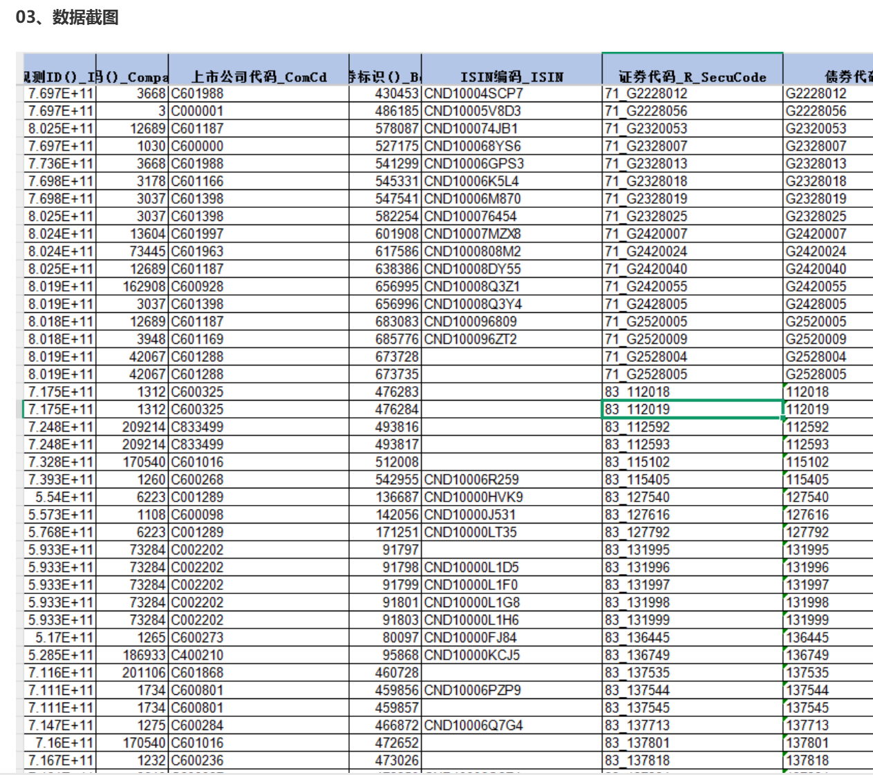 观测ID()_ID 公司代码()_CompanyCode 上市公司代码_ComCd 债券标识()_BdId ISIN编码_ISIN 证券代码_R_SecuCode 债券代码_BdCd 债券名称_BdNm 拼音债券简称_ChiSpelling 证券市场()_Secumkt 市场标识_Mktflg 债券全称_FBdNm 发行人是否上市公司()_IfListedIssuer 是否多个发行人()_IFMultiIssuer 债券形态()_BdMd 选择权类型_OptionType 债券类型()_BdType 是否跨市场()_IfCrsExchg 首次信息发布时间_IInfoPubDt 债项信用级别_CreditRt 计划发行总额(元)_PlanIssSz 实际发行总额(元)_ActlIssSz 债券期限_年(年)_Maturity 债券期限_天(天)_Maturity_Day 含权券特殊期限_OPMaturity 初始债券面值(元)_Par 初始发行价格(元)_IssPr 计量货币_currency 发行参考收益率(%)_IssRefYTM 计息方式()_IntMd 付息方式()_IntPayMethod 付息频率(次/年)_Freq 摊还期付息方式()_APIntPayMtd 支付机制说明_IntPayRmk 利息条款描述_IntItem 利息计算公式_IntFormula 利息计算公式(赋值)()_IntFormulaVal 兑付方式_RedeMtd 初始票面年利率(%)_CoupRt 利率变动区间_IntRtPeriod 是否含有信用风险缓释工具()_IfCRM 是否担保交收(交易所)()_IfGuaSet 债券标识_被增发()_BdId_RIssue ISIN编码_被增发_ISIN_RIssue 证券代码_被增发_R_SecuCode_RIssue 债券代码_被增发_BdCd_RIssue 债券名称_被增发_BdNm_RIssue 最新面值()_LatParValue 所得税率()_TaxRt 是否免税()_IfTaxFree 最新计价方式()_PricMethod 最新票面利率()_LatCoupRt 上市交易平台_ListMak 交易方式()_TradType 发行日期_IssDt 起息日(债券期限起始日)_ValueDt 债权债务登记日_RegDt 到期日(债券期限截止日)_MatDt 首次理论付息日_IntPayDt 上市日(交易流通起始日)_LstDt 摘牌日_DelstDt 实际到期日_EarlyMatDt 最后交易日(预估)_EstLastTrdDt 最后交易日(实际)_ActLastTrdDt 摘牌日(预估)_EstDelstDt 摘牌日(实际)_ActDelstDt 状态()_Status 备注_Remark 浮动利率计息基准()_BchmkIRCd 初始基准利率(%)_BchmkIR 初始基准利差(%)_BchSpread 债券保底利率(%)_MinIR 首个定价日_PrimalPriDt 利率调整模式_RatAdjMd 法定到期日_LegalEdt 发起机构_InitOrg 项目名称_PrjNm 初始起算日_StarDt 资产是否出表()_AssetIfTab 项目简称_PrjAbb 是否循环购买()_IfRevolving 循环期届满日_RevolvEndDt 分层级别_ABSLevel 分层级别细分()_ABSLevely 基础资产类型()_BasicAssetTyp 规模分层占比(%)_ABSLevelRat 利率上限说明_IntCap 债券封顶利率(%)_IntRtCap 是否多层级()_IfMultiLev 细分层总数量()_TotNumLev 初始投资人数量_IniInvNum 定向投资人数量_PriInvNum 债券标识_标的债务()_BdId_Target ISIN编码_标的债务_ISIN_Target 证券代码_标的债务_R_SecuCode_Target 债券代码_标的债务_BdCd_Target 债券名称_标的债务_BdNm_Target 标的债务流通总量(亿)_TargTotTrdShr 付费方式()_PayMtd 结算方式_SetMtd 信用事件_CredirEvent 计算机构()_CompMech 信用保护比例(%)_CreditProtRt 付费周期长度_月_PayCycle 信用保护触发范围()_CreditProtTrigRange 所得税税款承担方()_TaxPay