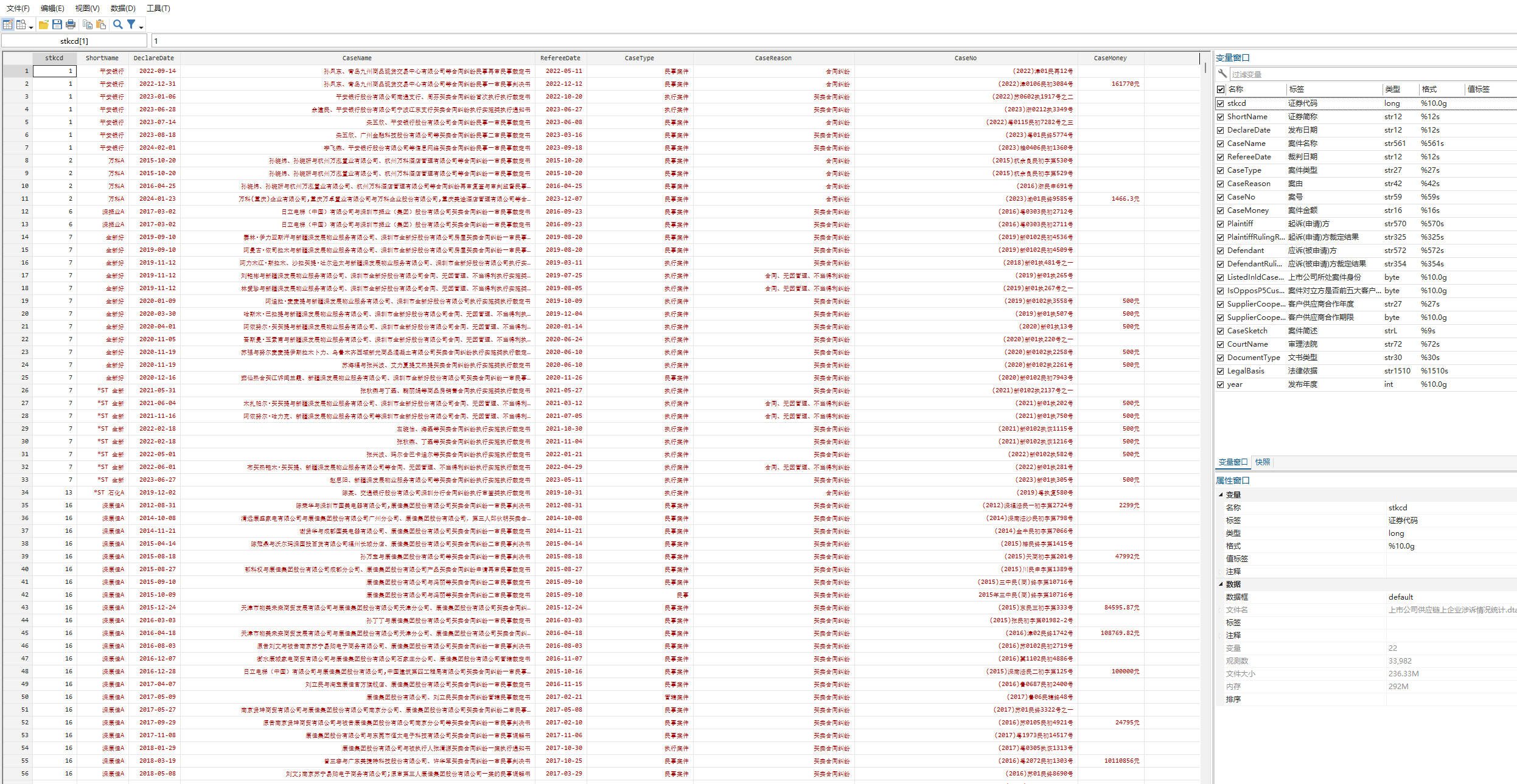 数据说明:上市公司供应链关联企业涉诉数据包括证券代码、案件名称、裁判日期、案件类型、案由、案号、案件金额、起诉(申请)方、起诉(申请)方裁定结果、上市公司所处案件身份、案件对立方是否前五大客户或供应商、客户供应商合作年度、客户供应商合作期限、案件简述、审理法院等等信息,数据提供.csv和.dta两种格式。
