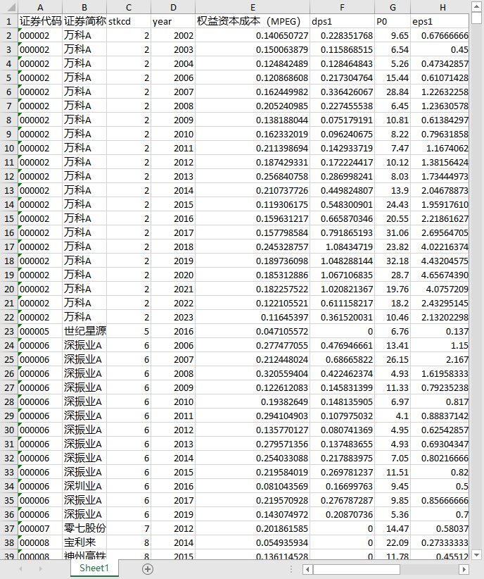 证券代码 证券简称 stkcd year 权益资本成本(MPEG) dps1股利支付率*每股收益 P0年收盘价 eps1每股收益 eps2每股收益 行业代码 行业名称 所属省份 所属省份代码 所属城市 所属城市代码