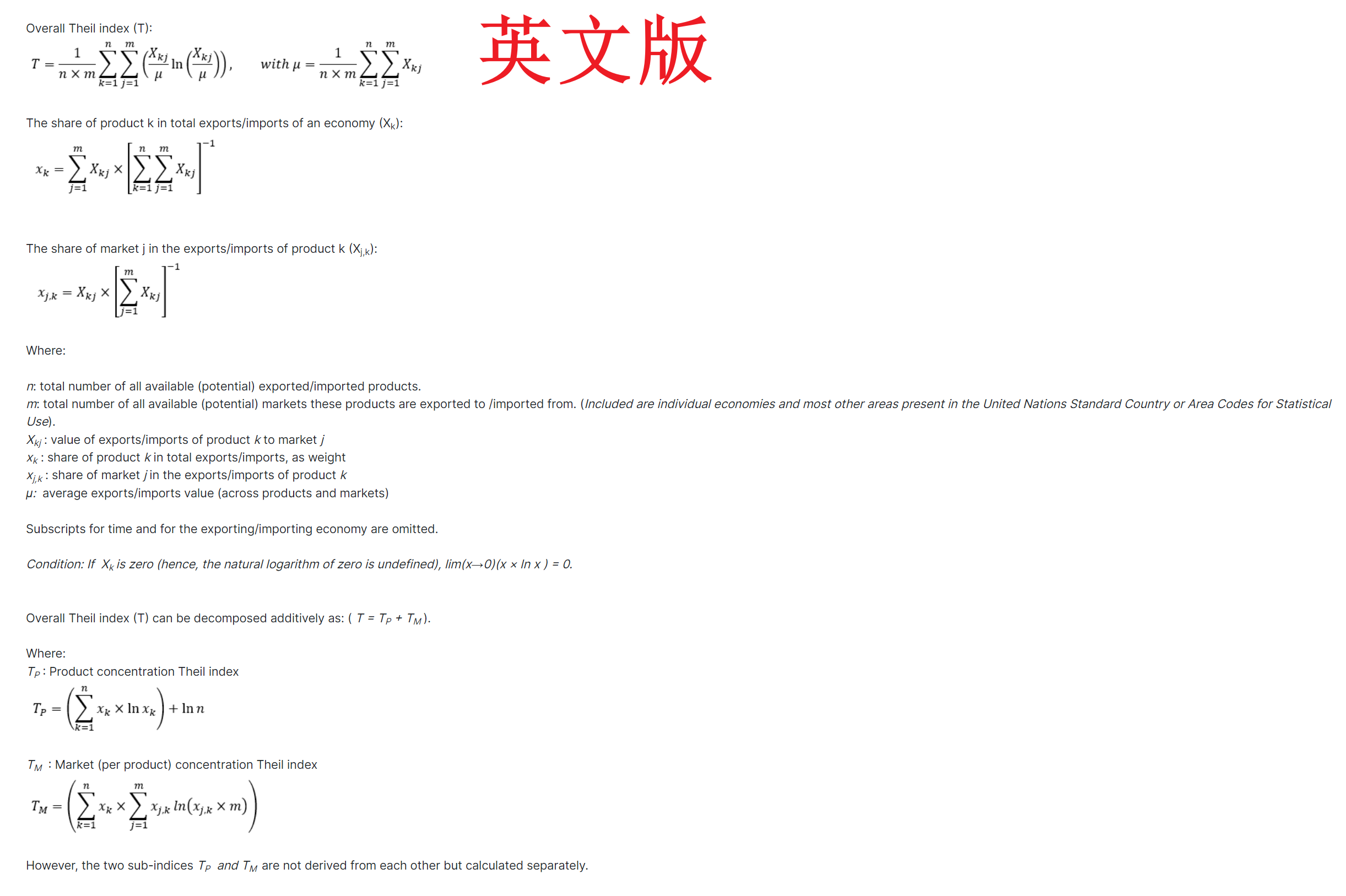 给定经济体或一组经济体的产品集中度泰尔指数等于对所有合作伙伴的产品层面出口/进口的泰尔指数。