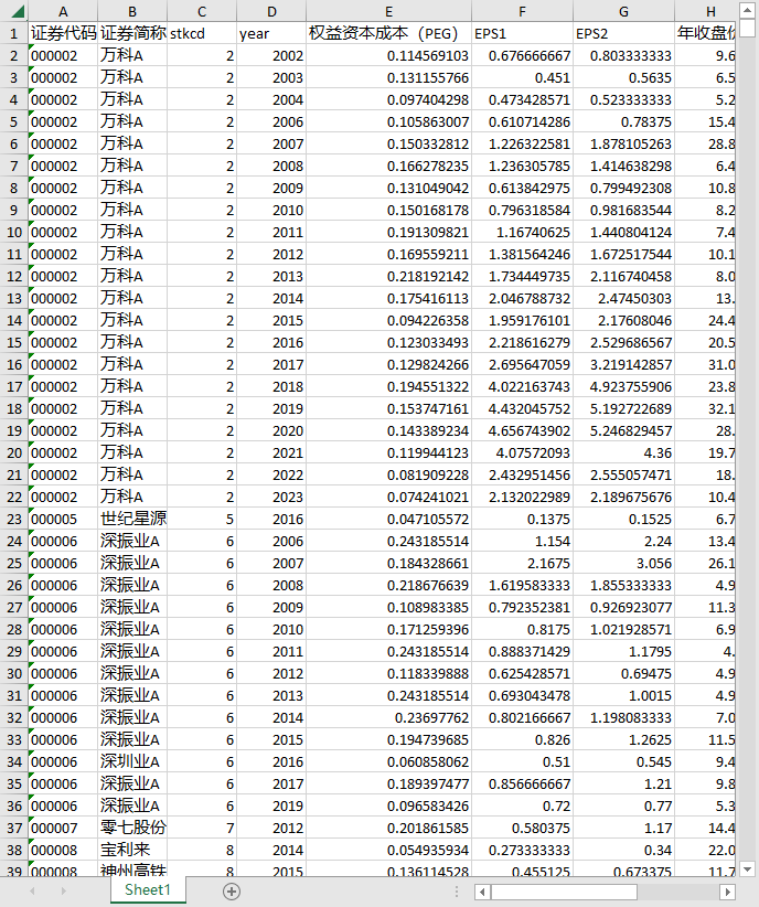 证券代码 证券简称 stkcd year 权益资本成本(PEG) EPS1每股收益 EPS2每股收益 年收盘价 行业代码 行业名称 所属省份 所属省份代码 所属城市 所属城市代码