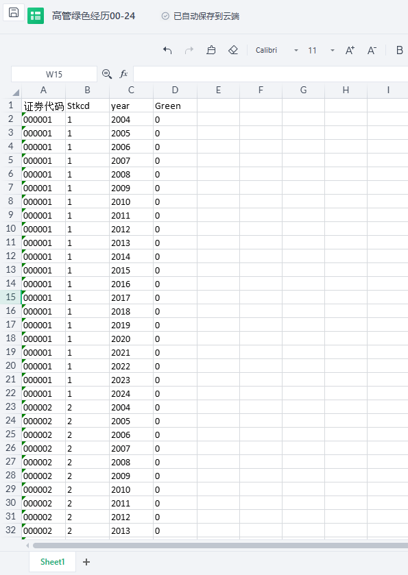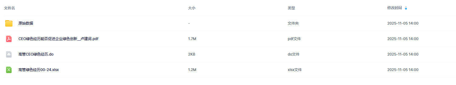 数据简介:参考C刊《经济管理》卢建词(2022)老师的研究,本文选取 CEO 为分析对象。 从高管个人简历数据中手工查找 CEO 以前是否接受过“绿色” 相关教育,若企业CEO 具有绿色经历,Green 取值 1,否则,取值 0。