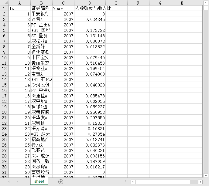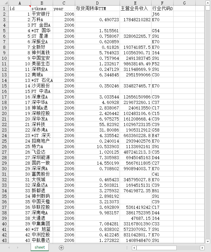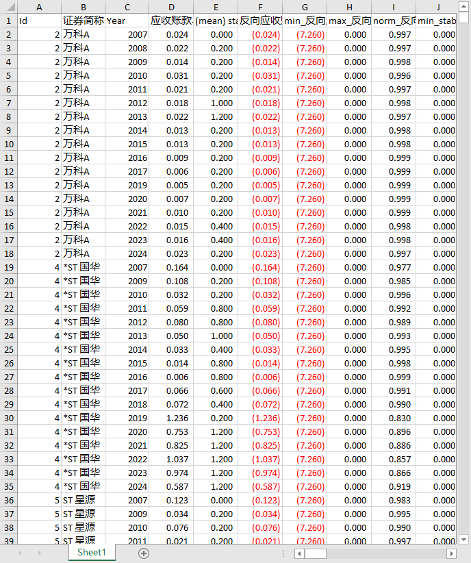 Id 证券简称 Year 应收账款与收入比 (mean) stability_ratio 反向应收账款与收入比 min_反向应收账款与收入比 max_反向应收账款与收入比 norm_反向应收账款与收入比 min_stability_ratio max_stability_ratio norm_stability_ratio entropy_反向应收账款与收入比 entropy_stability_ratio entropy_反向应收账款与收入比_sum entropy_stability_ratio_sum entropy_反向应收账款与收入比_final entropy_stability_ratio_final weight_反向应收账款与收入比 weight_stability_ratio 供应链抵抗力 stknme 存货周转率TTM 主营业务收入 主营业务收入_插值后 Industry 主营业务收入_Industry SI min_inventory_turnover max_inventory_turnover norm_inventory_turnover min_revenue max_revenue norm_revenue entropy_inventory_turnover entropy_revenue entropy_inventory_turnover_sum entropy_revenue_sum entropy_inventory_turnover_final entropy_revenue_final weight_inventory_turnover weight_revenue 供应链恢复力 min_供应链恢复力 max_供应链恢复力 norm_供应链恢复力 min_供应链抵抗力 max_供应链抵抗力 norm_供应链抵抗力 entropy_供应链恢复力 entropy_供应链抵抗力 entropy_供应链恢复力_sum entropy_供应链抵抗力_sum entropy_供应链恢复力_final entropy_供应链抵抗力_final weight_供应链恢复力 weight_供应链抵抗力 供应链韧性