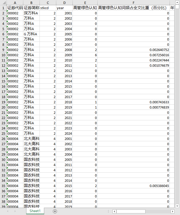 证券代码 证券简称 stkcd year 高管绿色认知 高管绿色认知词频占全文比重(百分比) 年报全文总词数 行业代码 行业名称 所属省份 所属省份代码 所属城市 所属城市代码