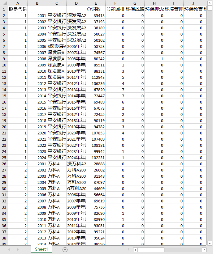 股票代码 年份 证券名称 总词数 节能减排 环保战略 环保理念 环境管理机构 环保教育 环保培训 环境技术开发 环境审计 节能环保 环保政策 环保部门 环保督查 低碳环保 环保工作 环保治理 环保和环境治理 环保设施 环保相关法律法规 环保治污