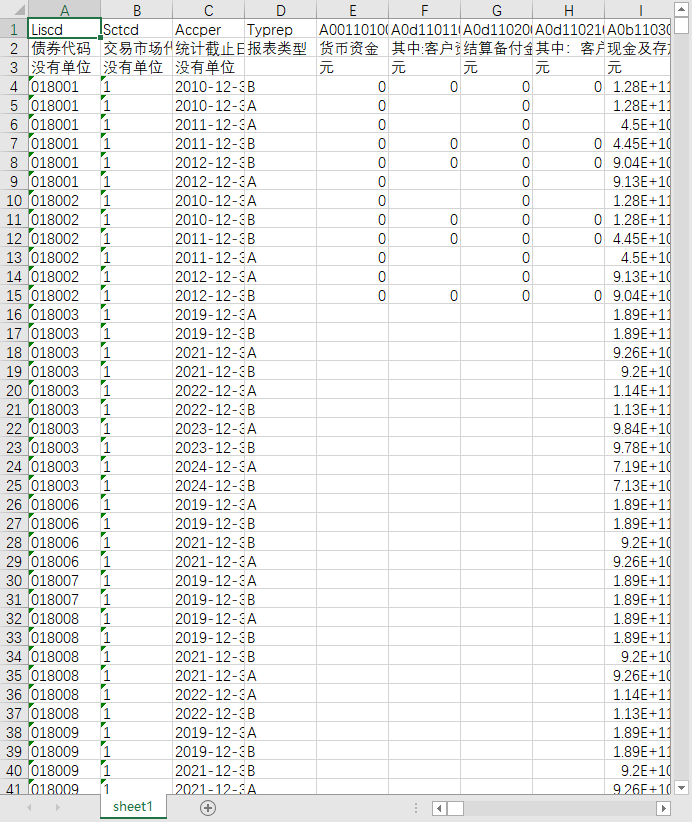 债券代码 交易市场代码 统计截止日期 报表类型 货币资金 其中:客户资金存款 结算备付金 其中:客户备付金 现金及存放中央银行款项 存放同业款项 贵金属 拆出资金净额 交易性金融资产 衍生金融资产 短期投资净额 应收票据净额 应收账款净额 应收款项融资 预付款项净额 应收保费净额 应收分保账款净额 应收代位追偿款净额 应收分保合同准备金净额 其中:应收分保未到期责任准备金净额 其中:应收分保未决赔款准备金净额 其中:应收分保寿险责任准备金净额 其中:应收分保长期健康险责任准备金净额 应收利息净额 应收股利净额 其他应收款净额 买入返售金融资产净额 存货净额 其中:数据资源(存货) 合同资产 持有待售资产 一年内到期的非流动资产 存出保证金 其他流动资产 流动资产合计 保户质押贷款净额 定期存款 发放贷款及垫款净额 债权投资 以摊余成本计量的金融资产 可供出售金融资产净额 其他债权投资 以公允价值计量且其变动计入其他综合收益的债务工具投资 持有至到期投资净额 长期应收款净额 长期股权投资净额 长期债权投资净额 以公允价值计量且其变动计入其他综合收益的权益工具投资 以公允价值计量且其变动计入其他综合收益的金融资产 长期投资净额 其他权益工具投资 其他非流动金融资产 存出资本保证金 独立账户资产 投资性房地产净额 固定资产净额 在建工程净额 工程物资 固定资产清理 生产性生物资产净额 油气资产净额 使用权资产 无形资产净额 其中:交易席位费 其中:数据资源(无形资产) 开发支出 其中:数据资源(开发支出) 商誉净额 长期待摊费用 递延所得税资产 代理业务资产 其他非流动资产 非流动资产合计 其他资产 资产总计 短期借款 其中:质押借款 应付短期融资款 向中央银行借款 吸收存款及同业存放 其中:同业及其他金融机构存放款项 其中:吸收存款 拆入资金 交易性金融负债 衍生金融负债 应付票据 应付账款 预收款项 合同负债 卖出回购金融资产款 应付手续费及佣金 应付职工薪酬 应交税费 应付利息 应付股利 应付赔付款 应付保单红利 保户储金及投资款 保险合同准备金 其中:未到期责任准备金 其中:未决赔款准备金 其中:寿险责任准备金 其中:长期健康险责任准备金 其他应付款 应付分保账款 代理买卖证券款 代理承销证券款 预收保费 持有待售负债 一年内到期的非流动负债 其他流动负债 递延收益-流动负债 流动负债合计 长期借款 独立账户负债 应付债券 租赁负债 长期应付款 长期应付职工薪酬 专项应付款 长期负债合计 预计负债 代理业务负债 递延所得税负债 其他非流动负债 递延收益-非流动负债 非流动负债合计 其他负债 负债合计 实收资本(或股本) 资本公积 其他权益工具 其中:优先股 其中:永续债 其中:其他 减:库存股 盈余公积 一般风险准备 未分配利润 外币报表折算差额 未确认的投资损失 交易风险准备 专项储备 其他综合收益 归属于母公司所有者权益合计 少数股东权益 所有者权益合计 负债与所有者权益总计