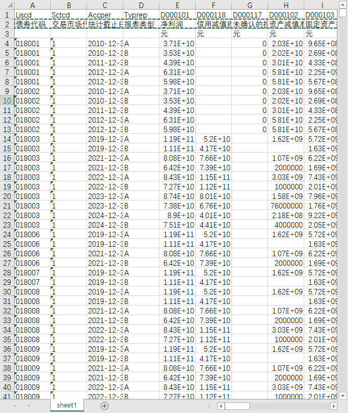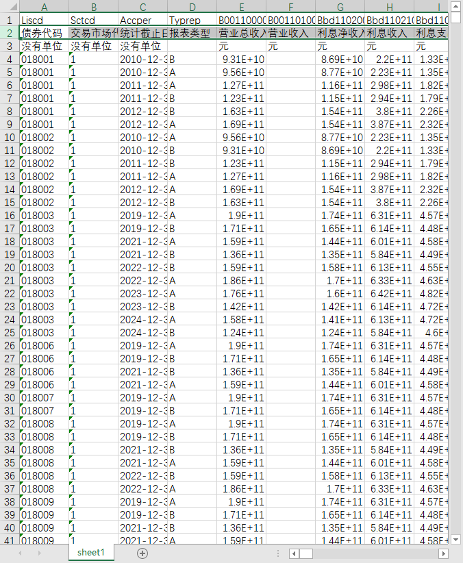 债券代码 交易市场代码 统计截止日期 报表类型 营业总收入 营业收入 利息净收入 利息收入 利息支出 已赚保费 保险业务收入 其中:分保费收入 减:分出保费 减:提取未到期责任准备金 手续费及佣金净收入 其中:代理买卖证券业务净收入 其中:证券承销业务净收入 其中:受托客户资产管理业务净收入 手续费及佣金收入 手续费及佣金支出 其他业务收入 营业总成本 营业成本 退保金 赔付支出净额 赔付支出 减:摊回赔付支出 提取保险责任准备金净额 提取保险责任准备金 减:摊回保险责任准备金 保单红利支出 分保费用 营业税金及附加 业务及管理费 减:摊回分保费用 保险业务手续费及佣金支出 销售费用 管理费用 研发费用 财务费用 其中:利息费用(财务费用) 其中:利息收入(财务费用) 资产减值损失 其他业务成本 其他收益 公允价值变动收益 投资收益 其中:对联营企业和合营企业的投资收益 其中:以摊余成本计量的金融资产终止确认收益 汇兑收益 净敞口套期收益 信用减值损失 资产处置收益 其他业务利润 营业利润 营业外收入 其中:非流动资产处置利得 营业外支出 其中:非流动资产处置净损益 其中:非流动资产处置损失 利润总额 所得税费用 未确认的投资损失 影响净利润的其他项目 净利润 持续经营净利润 终止经营净利润 归属于母公司所有者的净利润 归属于母公司其他权益工具持有者的净利润 少数股东损益 基本每股收益 稀释每股收益 其他综合收益(损失) 归属母公司所有者的其他综合收益的税后净额 归属于少数股东的其他综合收益的税后净额 综合收益总额 归属于母公司所有者的综合收益 归属于母公司其他权益工具持有者的综合收益总额 归属少数股东的综合收益