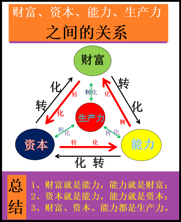 可见,资本就是能力,能力就是生产力。“资本财富论”就是资本创造财富,即是能力创造财富,或者说生产力创造财富。“资本财富论”是“劳动价值论”的发展和修正。