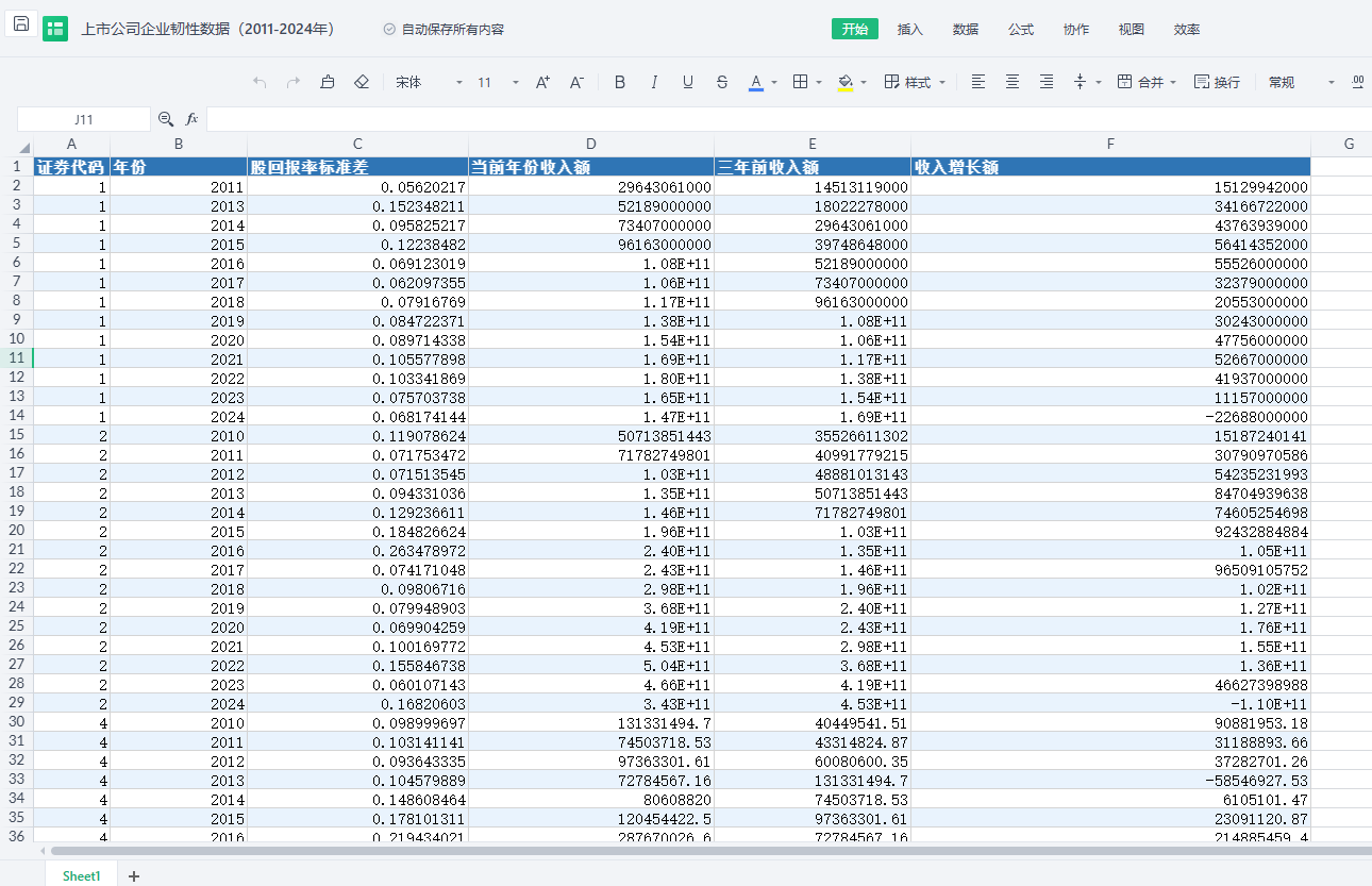 本数据以CNPD数据库中上市公司的月个股回报率数据和营业收入数据为基础,从2011-2024年的月个股回报率文件中以年为单位,计算得出每年年股票回报率标准差变量;根据2008-2024年的收入数据构造反映业绩增长性的“收入增长额”变量,采用当前年收入额减去三年前年收入额的计算方法,得到2011-2024年的各证券的收入增长额变量。以上两个变量维度可以共同量化企业韧性,便于后续研究。本数据使用的财务报表类型为合并报表。