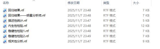 - 基础结果:描述性统计、相关系数矩阵、基础回归