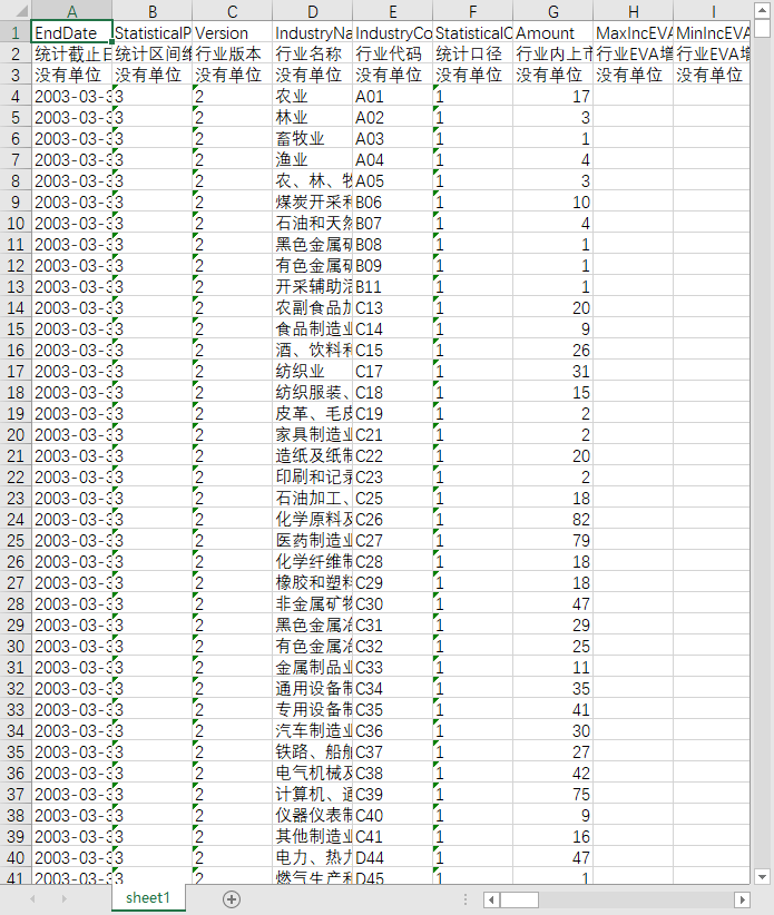 统计截止日期 统计区间维度 行业版本 行业名称 行业代码 统计口径 行业内上市公司数 行业EVA增幅最大值(同比) 行业EVA增幅最小值(同比) 行业EVA增幅中位数(同比) 行业EVA增幅平均值(同比) 行业EVA增幅标准差(同比) 行业EVA增幅最大值(环比) 行业EVA增幅最小值(环比) 行业EVA增幅中位数(环比) 行业EVA增幅平均值(环比) 行业EVA增幅标准差(环比) 行业人均EVA最大值 行业人均EVA最小值 行业人均EVA中位数 行业人均EVA平均值 行业人均EVA标准差 行业每股EVA最大值 行业每股EVA最小值 行业每股EVA中位数 行业每股EVA平均值 行业每股EVA标准差 行业EVA率最大值 行业EVA率最小值 行业EVA率中位数 行业EVA率平均值 行业EVA率标准差 行业总资产EVA率最大值 行业总资产EVA率最小值 行业总资产EVA率中位数 行业总资产EVA率平均值 行业总资产EVA率标准差 行业净资产EVA率最大值 行业净资产EVA率最小值 行业净资产EVA率中位数 行业净资产EVA率平均值 行业净资产EVA率标准差 销售EVA率最大值 销售EVA率最小值 销售EVA率中位数 销售EVA率平均值 销售EVA率标准差