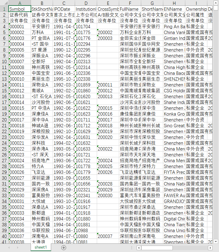 证券代码 证券中文简称 首次上市日期 上市公司ID A/B股交叉码 公司中文全称 公司中文简称 公司英文全称 公司属性 退市日期 上市板块 行业名称C 行业代码C 行业名称B 行业代码B 行业名称A 行业代码A 注册资本 经营范围