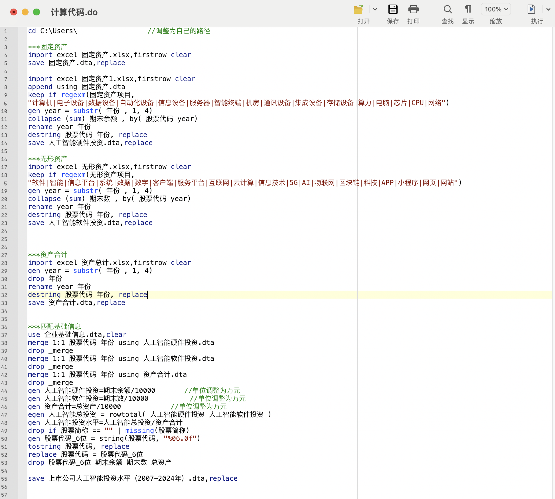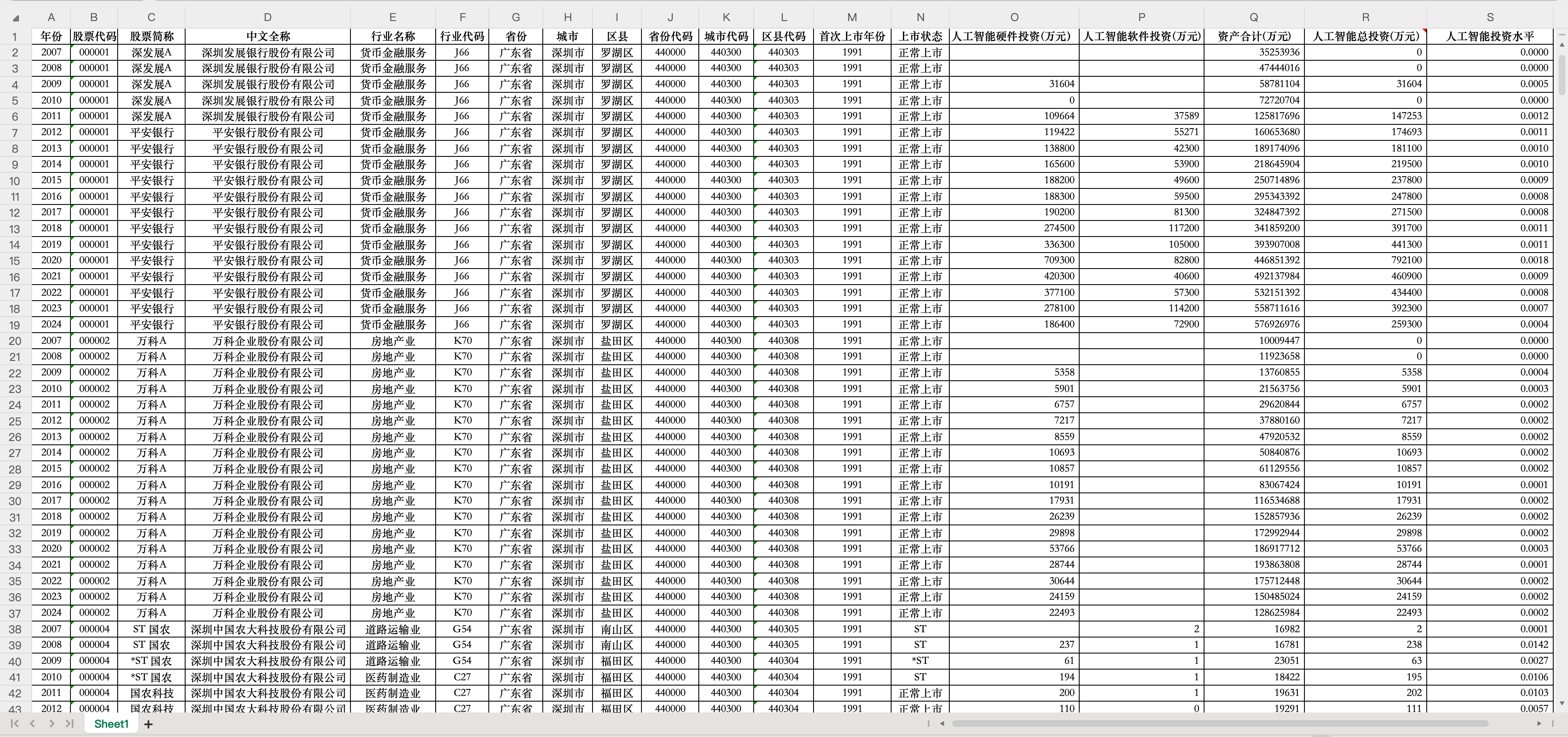 参考李果(2024)对企业人工智能投资水平指标的衡量和测算的方法,团队依据上市公司财务报告附注信息,采用关键词筛选法,整理形成人工智能投资水平数据