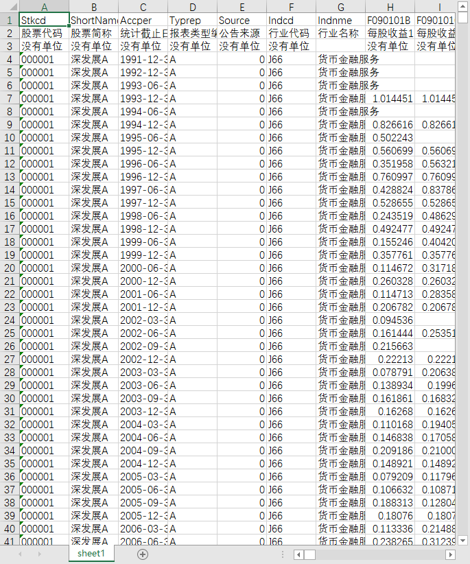 股票代码 股票简称 统计截止日期 报表类型编码 公告来源 行业代码 行业名称 每股收益1 每股收益TTM1 每股收益2 每股收益TTM2 每股收益3 每股收益TTM3 每股收益4 每股收益TTM4 每股综合收益1 每股综合收益TTM1 每股综合收益2 每股综合收益TTM2 归属于母公司每股收益1 归属于母公司每股收益TTM1 归属于母公司每股综合收益1 归属于母公司每股综合收益TTM1 每股营业总收入1 每股营业总收入TTM1 每股营业收入1 每股营业收入TTM1 息税前每股收益1 息税前每股收益TTM1 息税折旧摊销前每股收益1 息税折旧摊销前每股收益TTM1 每股营业利润1 每股营业利润TTM1 每股净资产1 每股有形资产1 每股负债1 每股资本公积1 每股盈余公积1 每股未分配利润1 每股留存收益1 归属于母公司每股净资产1 每股经营活动产生的现金流量净额1 每股经营活动产生的现金流量净额TTM1 每股投资活动现金净流量1 每股投资活动现金净流量TTM1 每股筹资活动现金净流量1 每股筹资活动现金净流量TTM1 每股企业自由现金流量1 每股企业自由现金流量TTM1 每股股东自由现金流量1 每股股东自由现金流量TTM1 每股折旧和摊销1 每股折旧和摊销TTM1 每股企业自由现金流(原有) 每股股权自由现金流(原有) 每股现金净流量1 每股现金净流量TTM1 每股现金净流量2 每股现金净流量TTM2 归属于母公司每股收益2 归属于母公司每股收益TTM2 归属于母公司每股综合收益2 归属于公司每股综合收益TTM2 每股营业总收入2 每股营业总收入TTM2 每股营业收入2 每股营业收入TTM2 息税前每股收益2 息税前每股收益TTM2 息税折旧摊销前每股收益2 息税折旧摊销前每股收益TTM2 每股营业利润2 每股营业利润TTM2 每股净资产2 每股有形资产2 每股负债2 每股资本公积2 每股盈余公积2 每股未分配利润2 每股留存收益2 归属于母公司每股净资产2 每股经营活动产生的现金流量净额2 每股经营活动产生的现金流量净额TTM2 每股投资活动现金净流量2 每股投资活动现金净流量TTM2 每股筹资活动现金净流量2 每股筹资活动现金净流量TTM2 每股企业自由现金流量2 每股企业自由现金流量TTM2 每股股东自由现金流量2 每股股东自由现金流量TTM2 每股折旧和摊销2 每股折旧和摊销TTM2 每股企业自由现金流量3 每股股东自由现金流量3 行业代码1 行业名称1