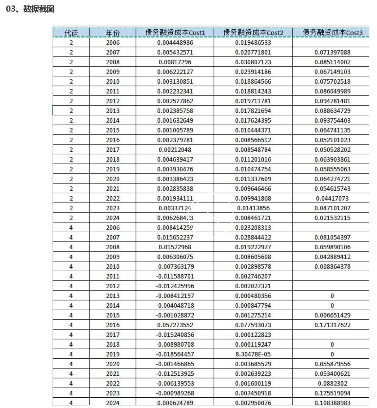 代码 年份 债务融资成本Cost1 债务融资成本Cost2 债务融资成本Cost3