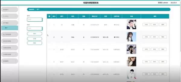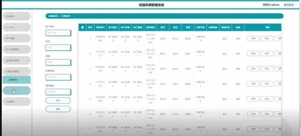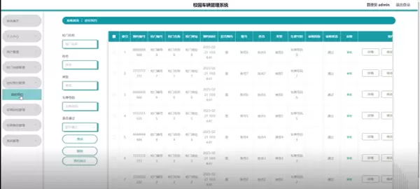 管理员点击车辆进校管理,在车辆进校页面输入校门名称、姓名、类型、车牌号码和选择是否通过以查询或删除车辆进校列表,并根据需求对车辆进校详情信息进行查看、修改或删除操作;如图5-10所示: