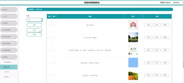 管理员点击系统管理,在通知公告页面输入标题以查询、新增或删除通知公告列表,并根据需求对通知公告详情信息进行查看、修改或删除操作;还可以对轮播图管理、关于我们及系统简介进行相应的处理;如图5-12所示: