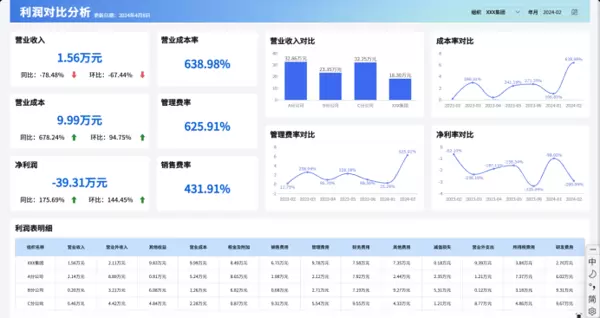 如何构建一份直观的利润表?我们可以借助数据分析工具,比如我工作中常用的FineBI来搭建这套利润对比分析图表,通过拖拽组件就能生成,这样你在分析时可以将每个模块逐一拆解,更加直观。我把这份模板放在这里,改改参数就能套用,需要自取: