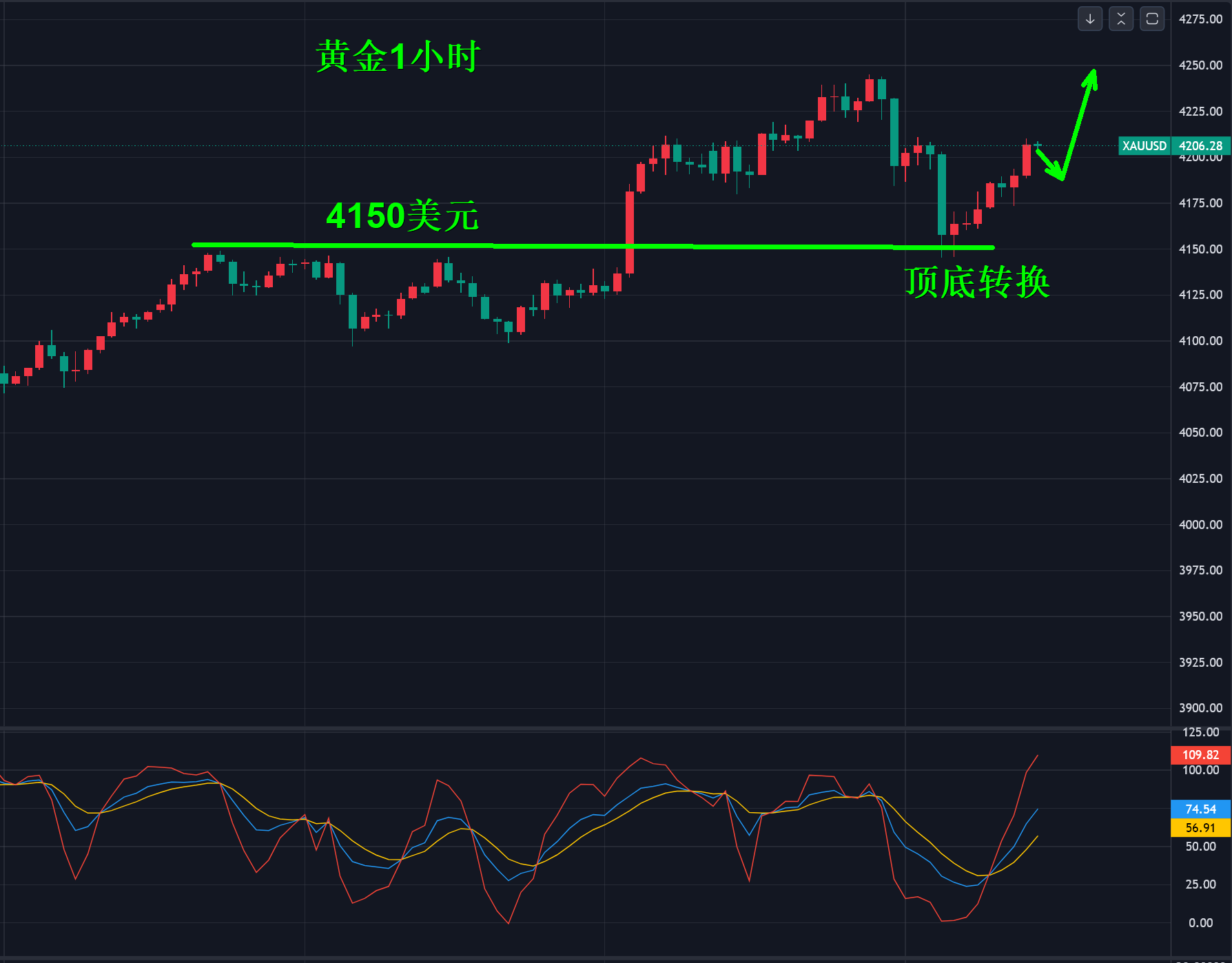 周四,黄金冲击4240美元高位后中途倒车,刚好打到顶底转换4150美元的支撑点,一次完美的回踩确认,反弹现在没有结束,只有二次下调破了4150美元才能宣布此次反弹“破产”。