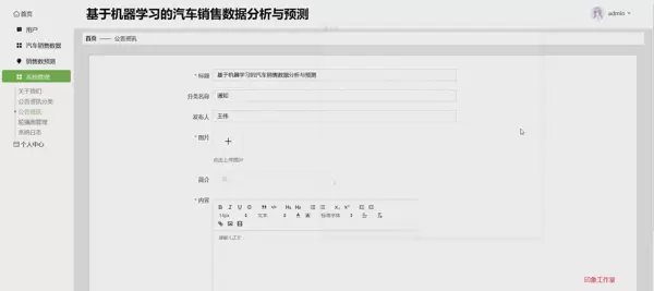 在本论文中,提出并实现了一个基于机器学习的汽车销售数据分析与预测系统。该系统的构建旨在提升汽车销售数据管理效率、优化销售预测精度以及增强用户和管理员之间的互动性。文章首先探讨了研究背景及其重要性,明确了当前大数据和机器学习技术迅猛发展的环境中,传统汽车销售数据管理方法所面临的挑战与不足。通过详述系统需求分析、架构设计及数据库规划,论文展现了一个面向用户和管理员的全方位汽车销售数据分析与预测平台。在客户端,系统提供了查看汽车销售信息、公告更新和个人中心管理的功能;而管理员则能够通过该系统对销售数据进行管理和调整、查阅并修订销售预测,以及发布和管理公告信息。整个系统采用Python语言开发,后端利用Django框架构建,前端采用了Vue技术实现,数据库方面选择了MySQL,并结合机器学习算法完成了销售数据分析与预测。