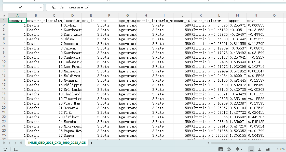 变量信息:变量包括测量ID、测量名称、地点ID、地点名称、性别ID、性别名称、年龄组名称、年份ID、指标ID、指标名称、病因ID、病因名称、CKD阶段名称、人口数、估计值、95%不确定性区间的上下限等。