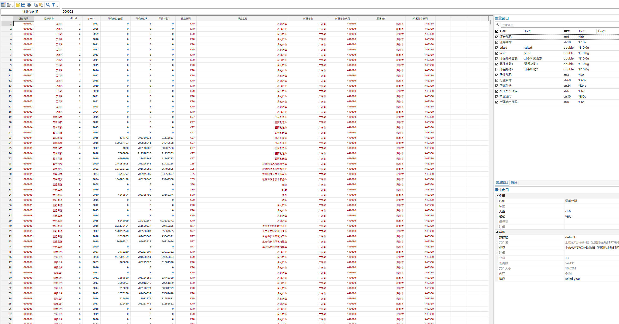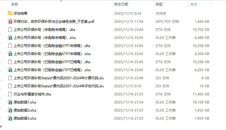 - 三个版本:上市公司企业环保补助(未剔除未缩尾)、上市公司企业环保补助(已剔除金融STPT未缩尾)、上市公司企业环保补助(已剔除金融STPT已缩尾)