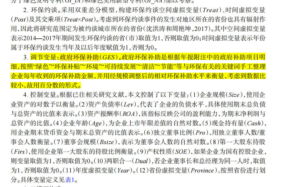 ZF环保补助(GES)。ZF环保补助是根据年报附注中的ZF补助项目明细,按照“绿色”“环保补贴”“环境”“可持续发展”“清洁”“节能”等与环保有关的关键词手工整理企业每年收到的环保补助金额,并用经规模调整后的相对环保补助水平来衡量,考虑到数据比较小,故用百分数的形式。