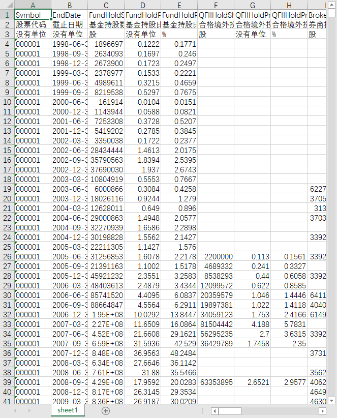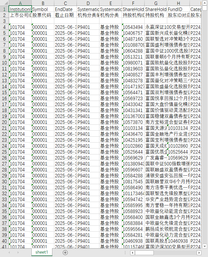 上市公司ID 股票代码 截止日期 机构分类编码 机构分类 持股机构ID 持股机构 股东ID对应的基金ID 股东类别编码 持股数量 持股比例(相对总股本) 持股比例(相对流通A股) 股票价格 上期统计截止日期 上期持股机构ID 上期持股数量 上期持股比例(相对总股本) 上期持股比例(相对流通A股) 上期股票价格 期间送转增配股比例 增减维持标识 行业代码 行业名称 数据来源 行业代码1 行业名称1