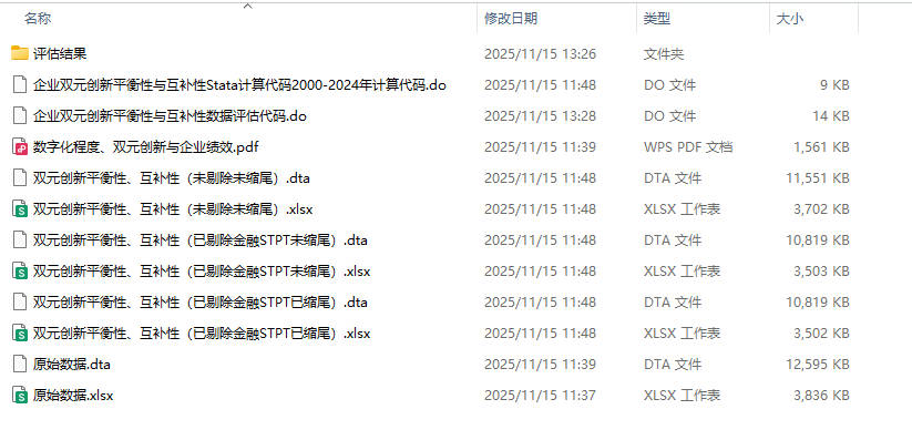 - 三个版本:上市公司企业企业创新平衡性与互补性(未剔除未缩尾)、上市公司企业企业创新平衡性与互补性(已剔除金融STPT未缩尾)、上市公司企业企业创新平衡性与互补性(已剔除金融STPT已缩尾)