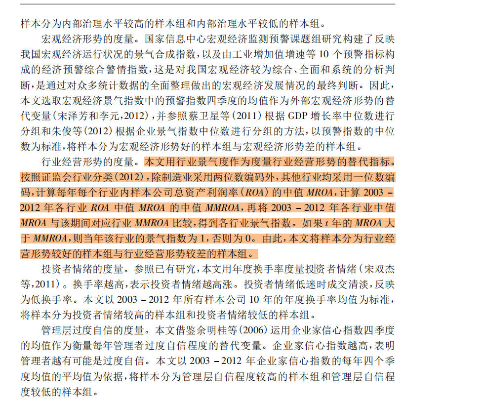 本文用行业景气度作为度量行业经营形势的替代指标。按照证监会行业分类( 2012) ,除制造业采用两位数编码外,其他行业均采用一位数编码,计算每年每个行业内样本公司总资产利润率( ROA) 的中值 MROA,计算 2003 -2012 年各行业 ROA 中值 MROA 的中值 MMROA,再将 2003 - 2012 年各行业中值MROA 与该期间对应行业 MMROA 比较,得到各行业景气指数。如果 t 年的 MROA 大于 MMROA,则当年该行业的景气指数为 1,否则为 0。由此,本文将样本分为行业经营形势较好的样本组与行业经营形势较差的样本组。